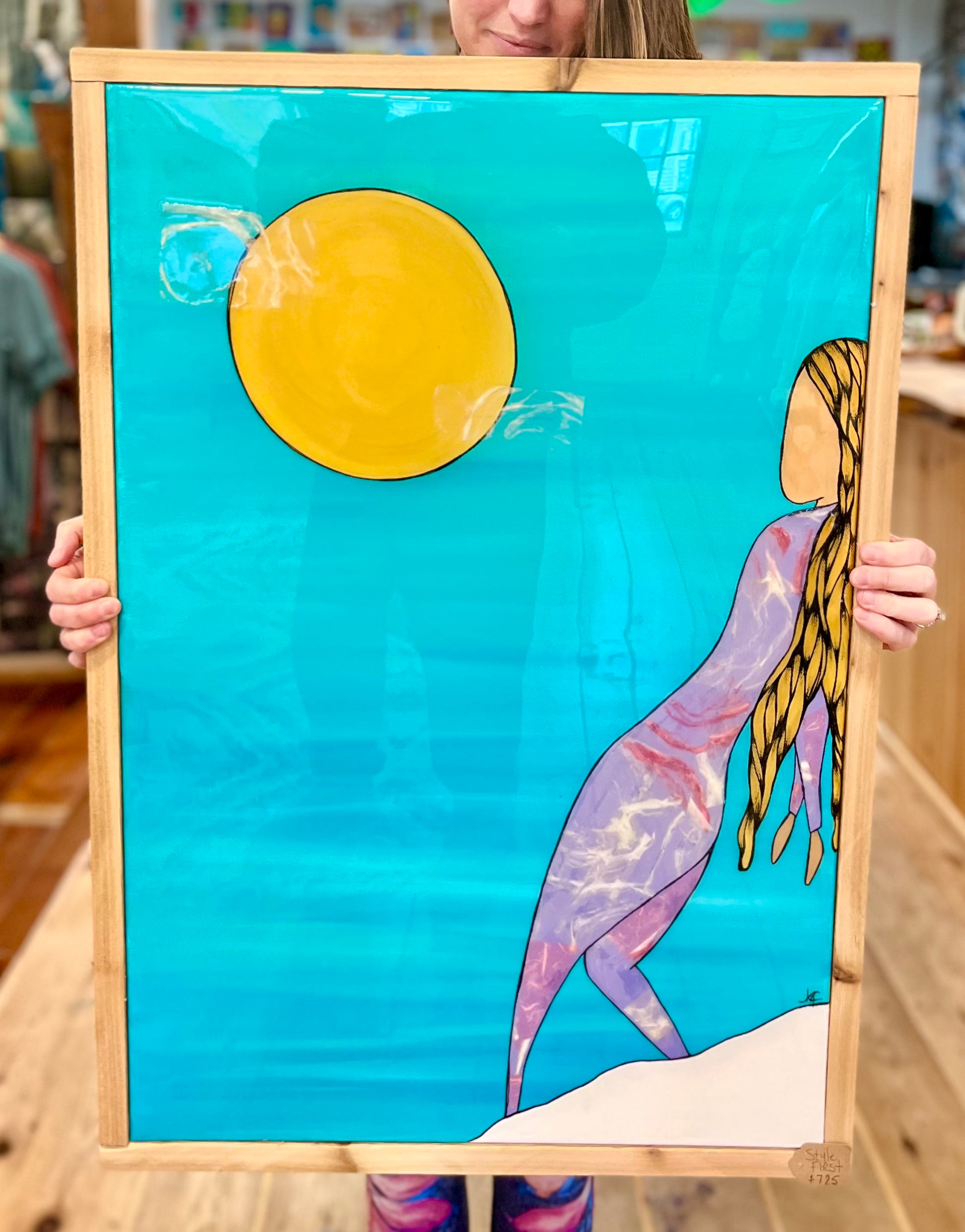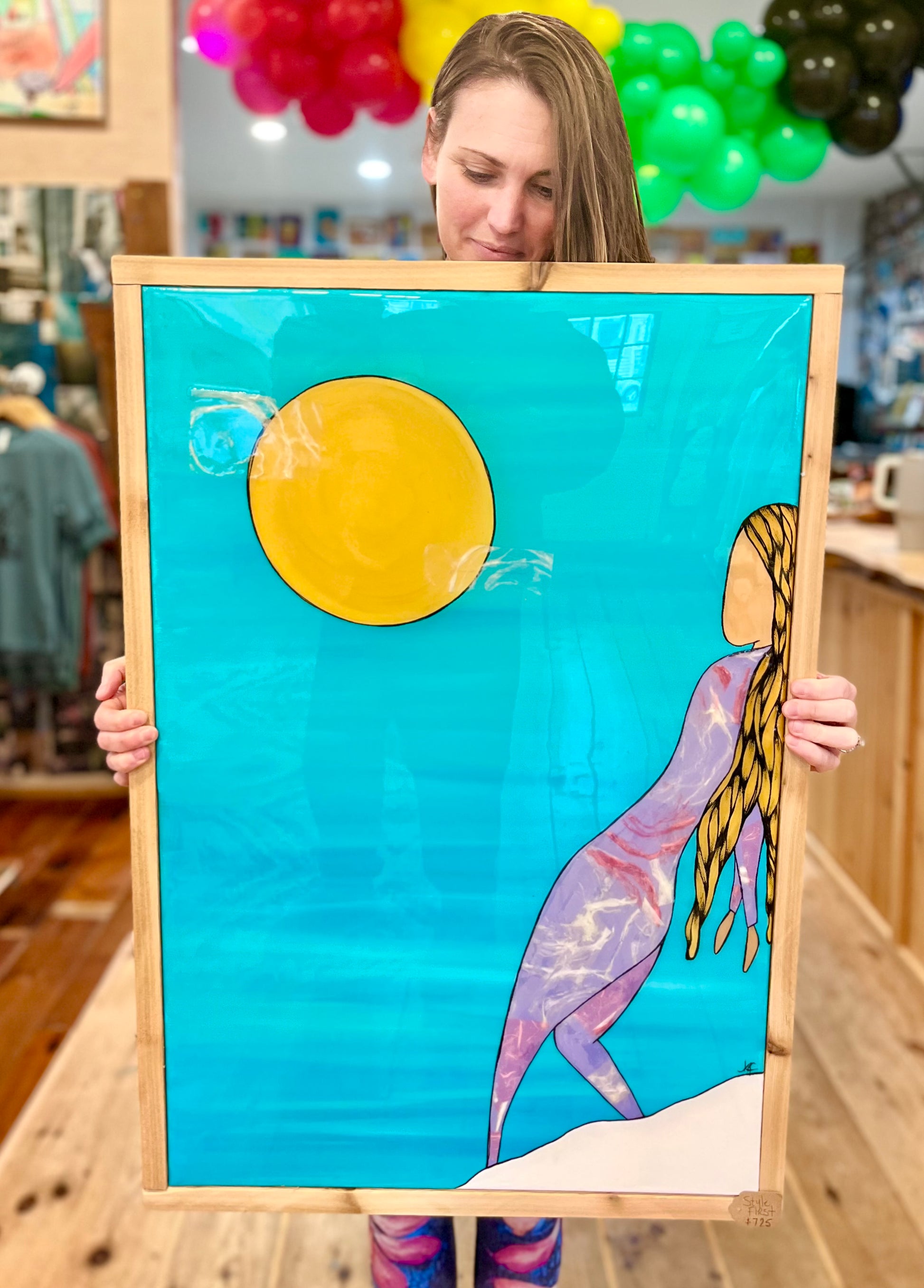 Original artwork. Acrylic/mixed media on canvas. Epoxy resin glass coat. Custom cedar frame 21”x 31”
