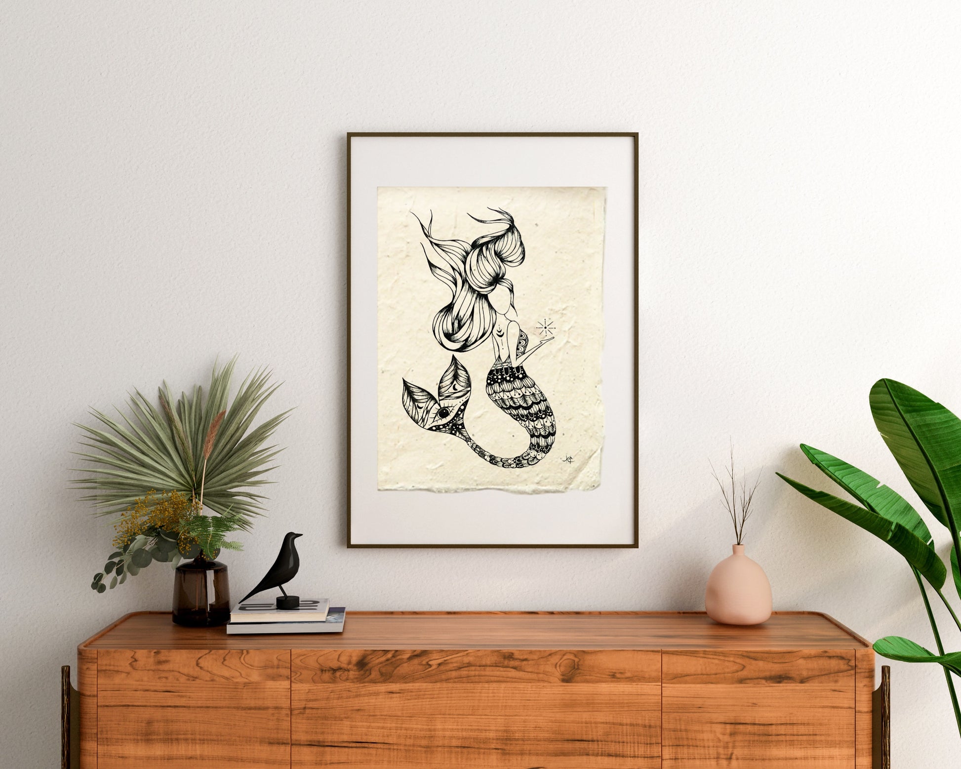 Hand drawn original artwork on plant based nepalese paper. Approx. 10"x13". Pictured in an 11x14 float frame.