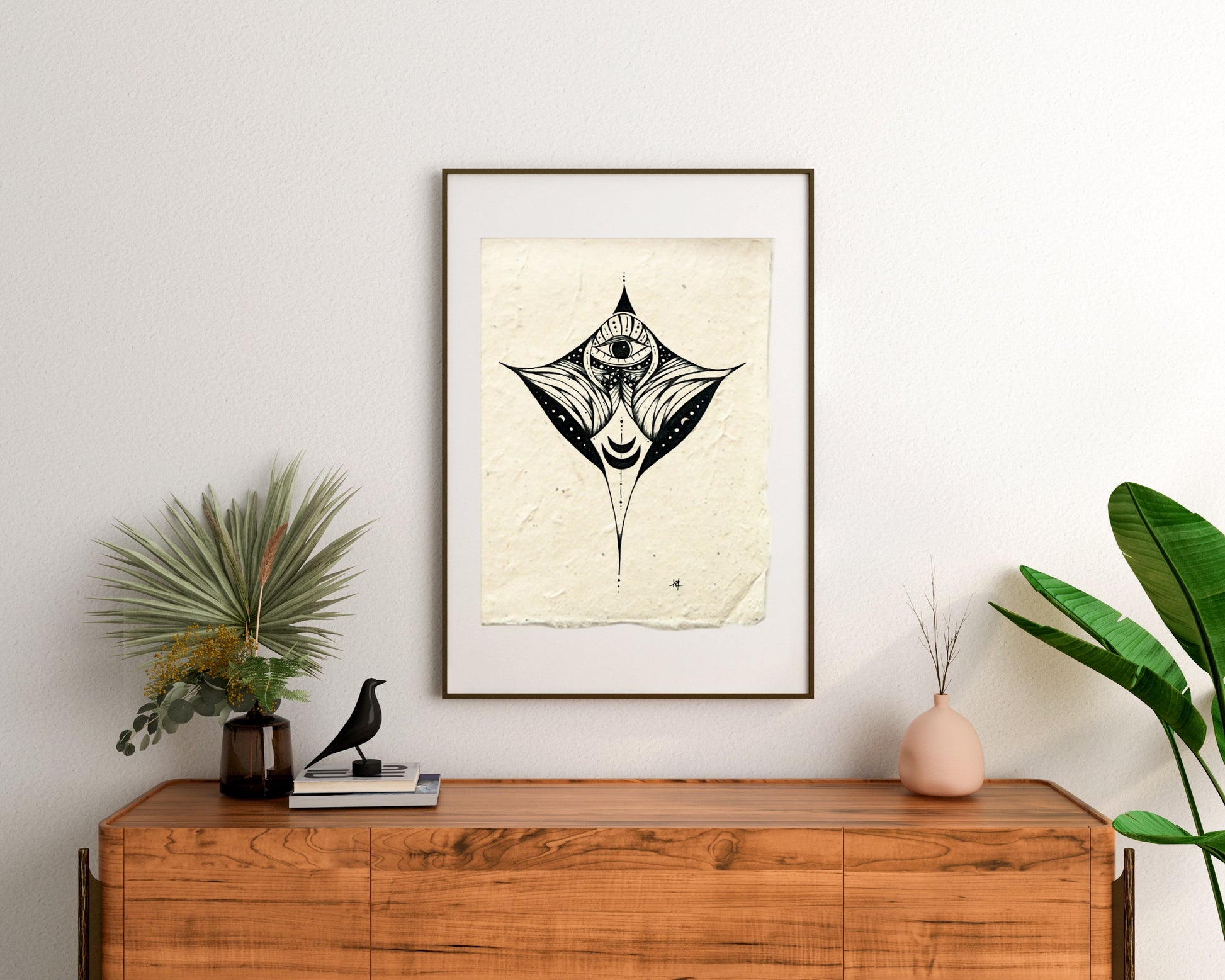Hand drawn original artwork on plant based nepalese paper. Approx. 10"x13". Pictured in an 11x14 float frame.