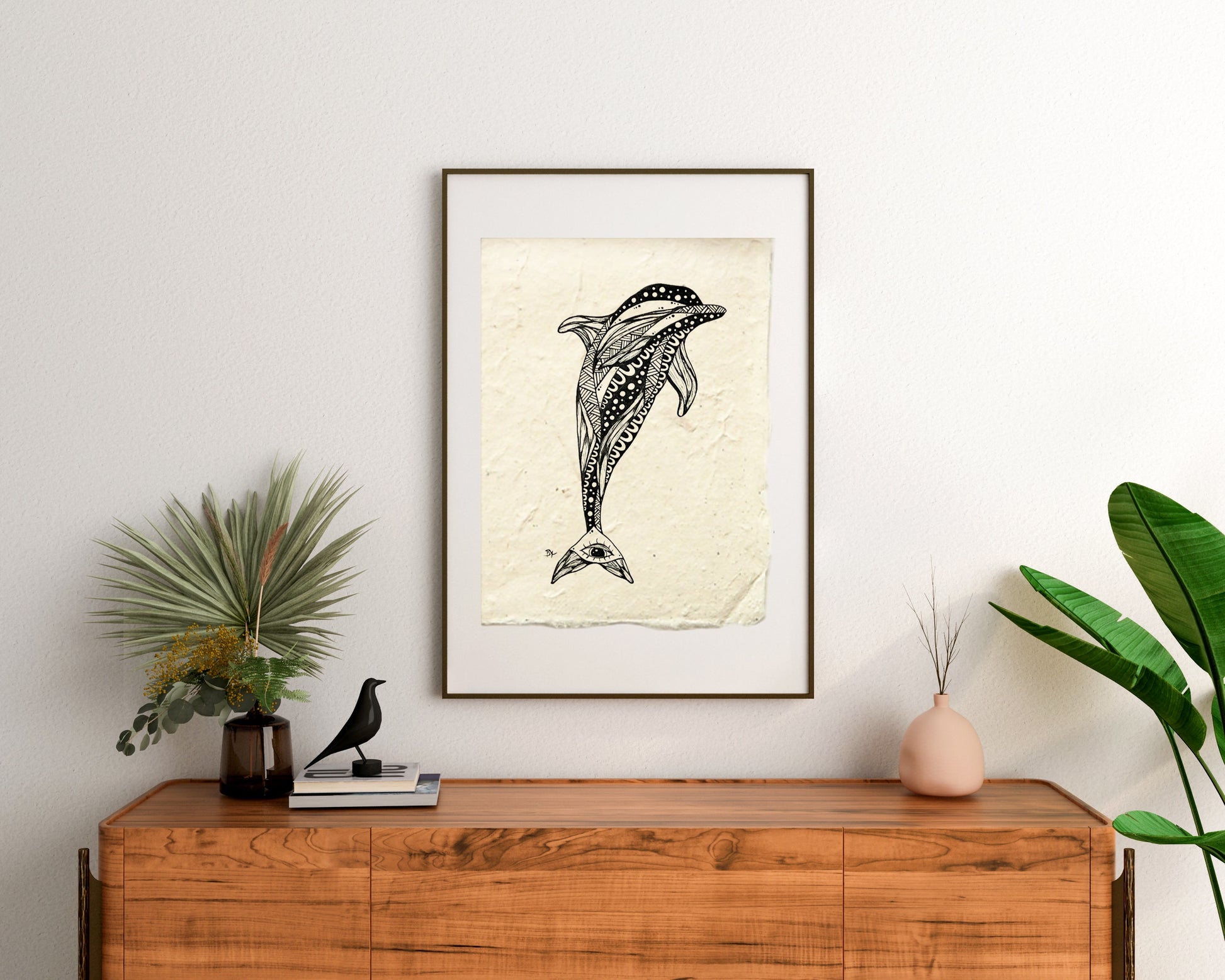 Hand drawn original artwork on plant based nepalese paper. Approx. 10' x 13" Pictured in an 11x14 float frame.