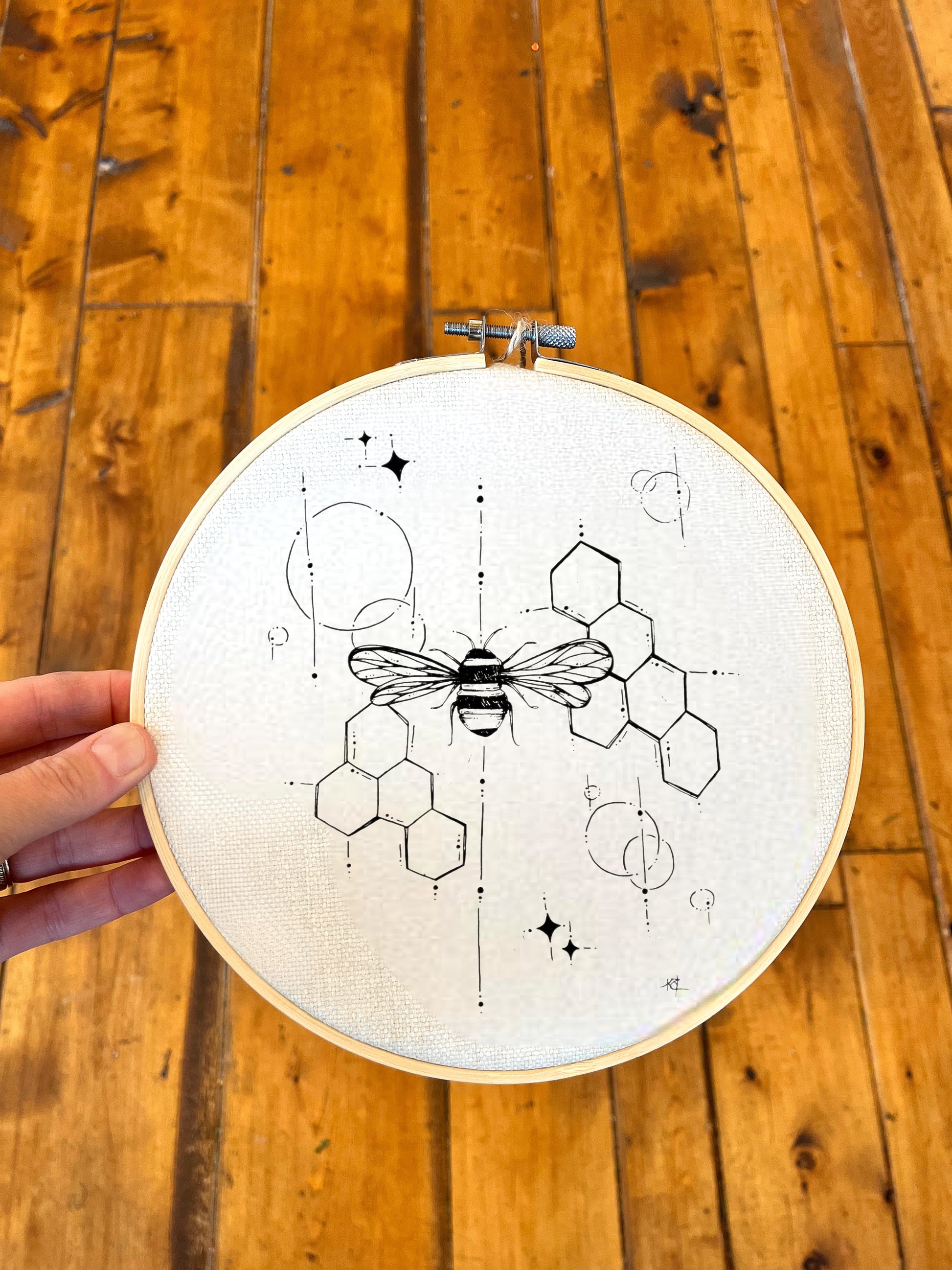 8” circular wall hanging. Canvas design with wood hoop frame.