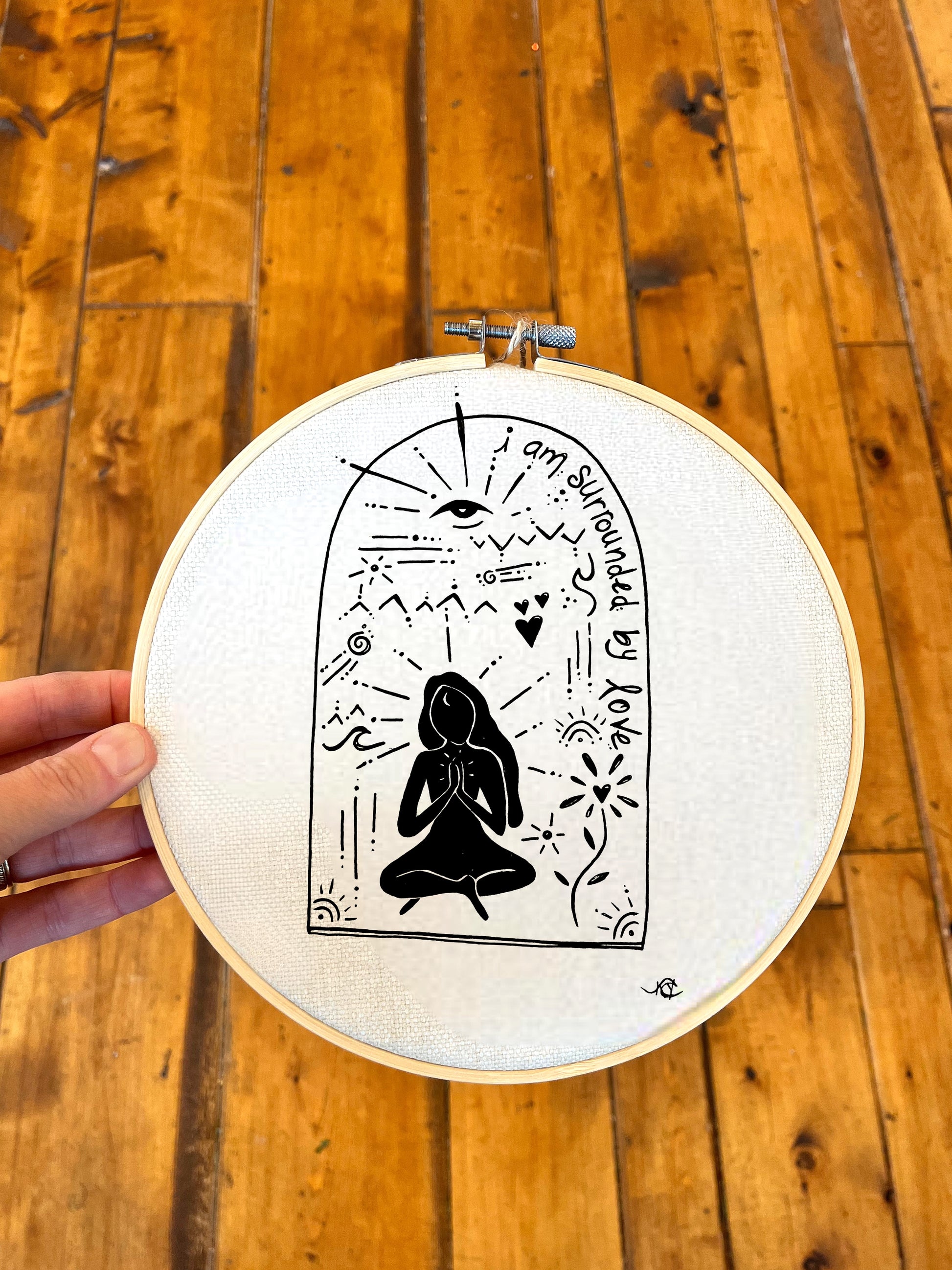 8” circular wall hanging. Canvas design with wood hoop frame.