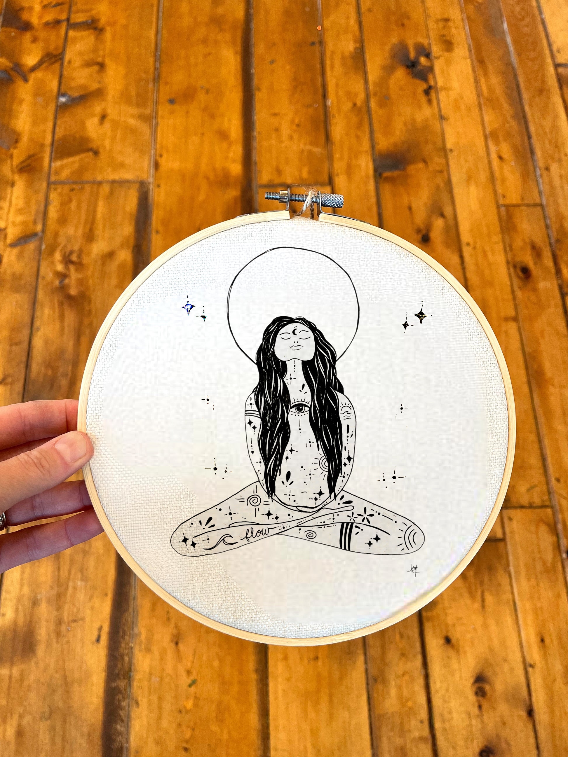 8” circular wall hanging. Canvas design with wood hoop frame.