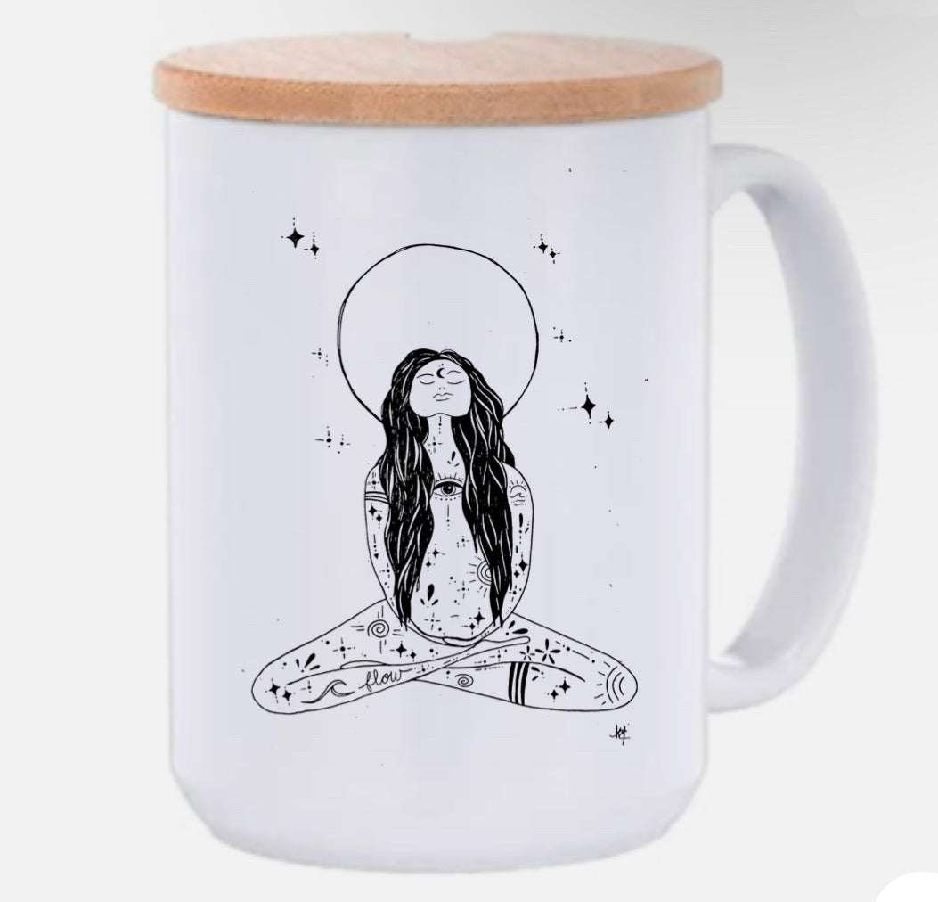 15oz. ceramic mug. Includes bamboo lid with small straw hole which helps insulate and keep your drink warm/cold for longer.