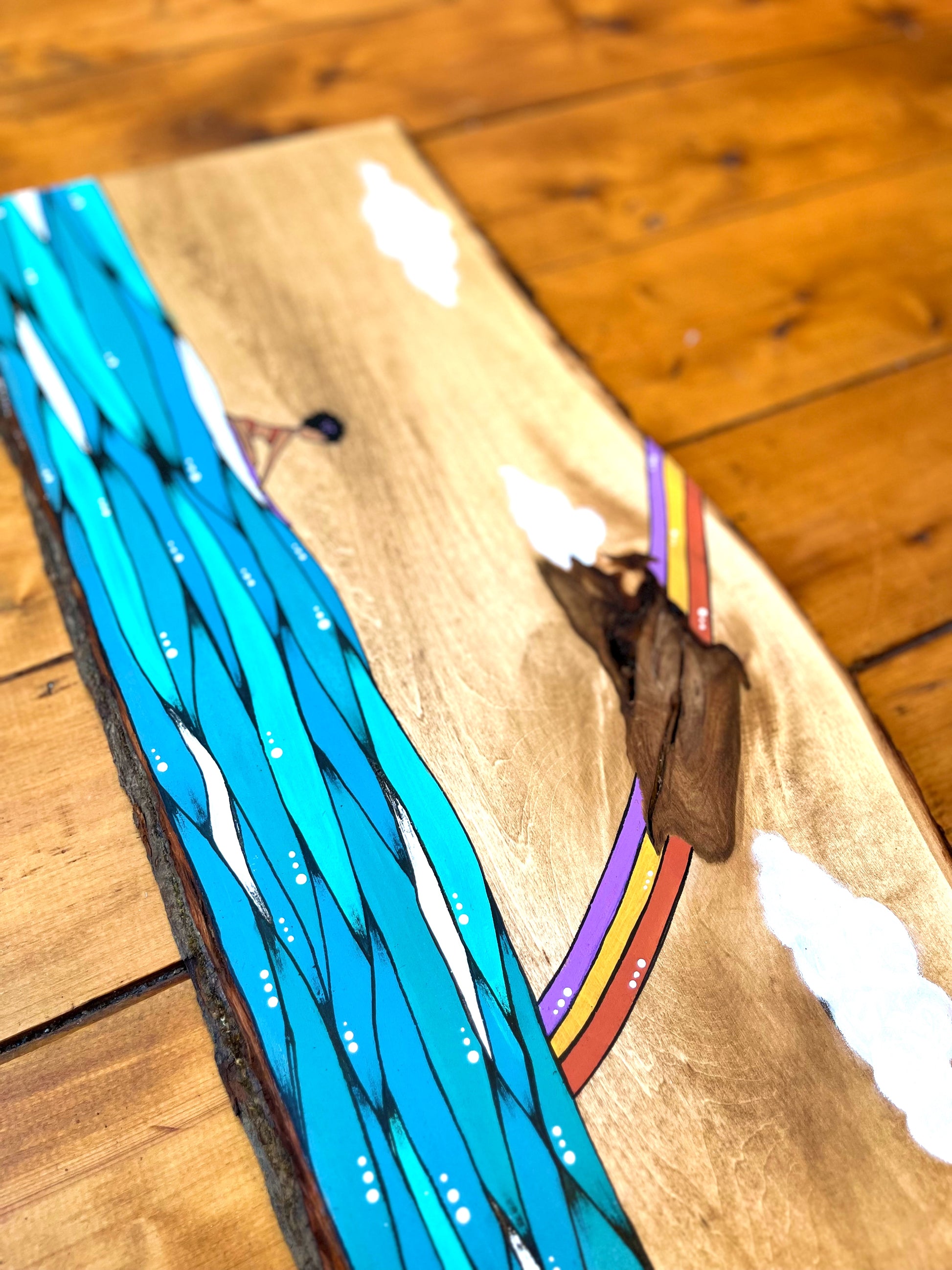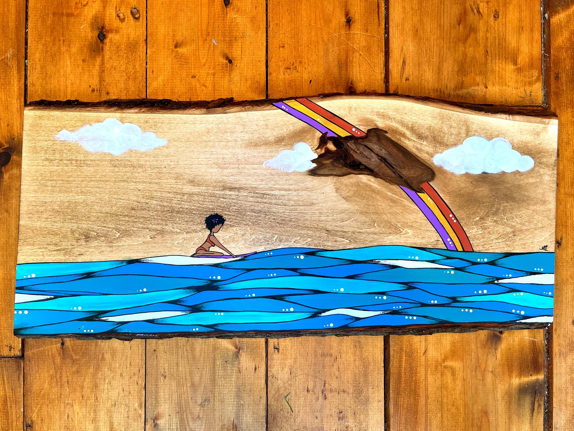 Original artwork on reclaimed walnut basswood. 23”x10”