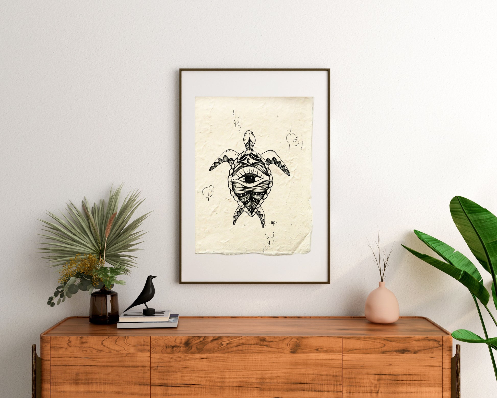 Hand drawn original artwork on plant based nepalese paper. Approx. 10"x13". Pictured in an 11x14 float frame.